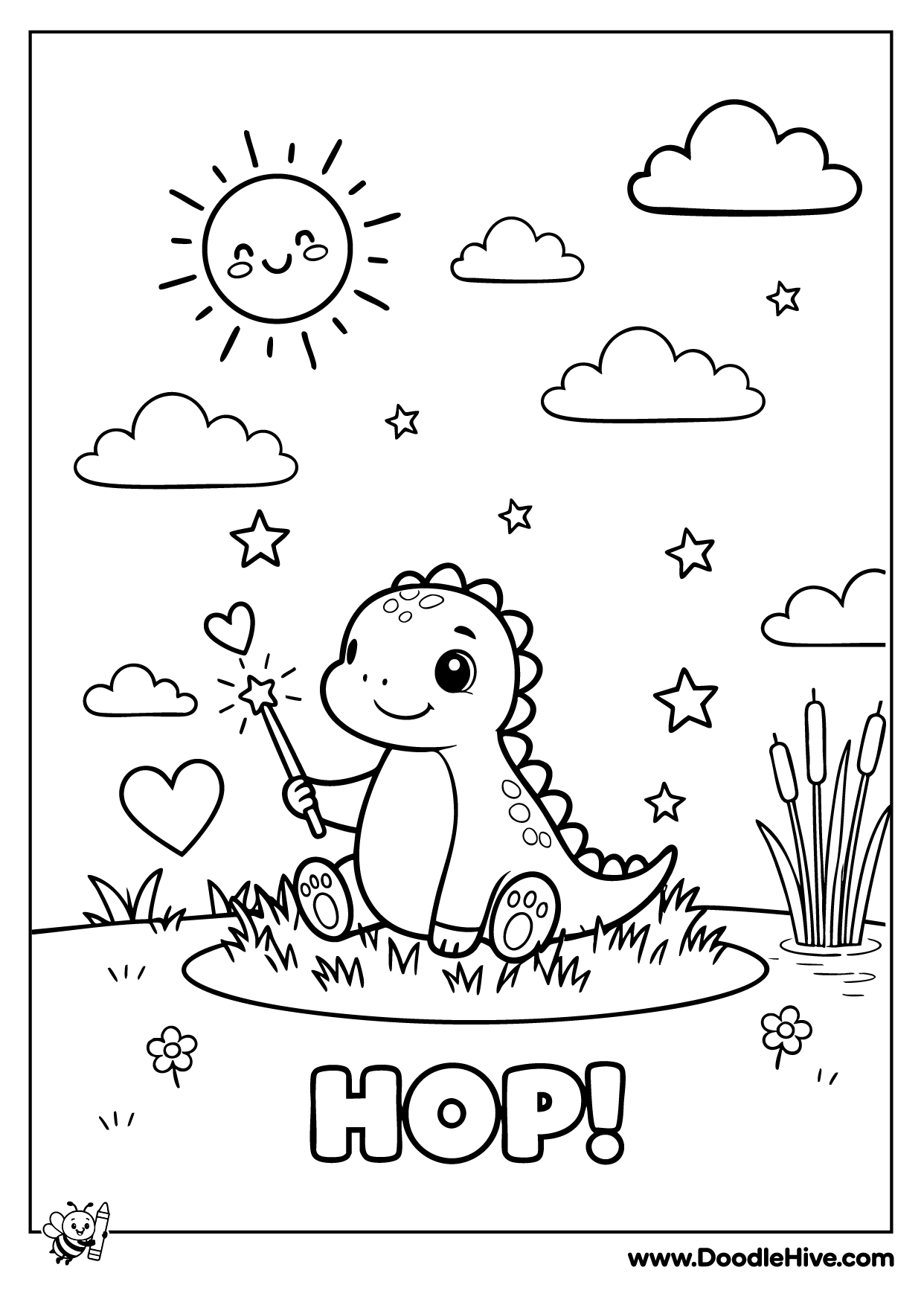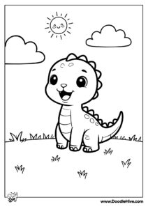Meet this adorable baby dinosaur sitting happily in a grassy field while holding a magical star wand. Surrounded by stars, clouds, and a smiling sun, this cute dinosaur coloring page is perfect for kids who love dinosaurs and imaginative adventures.
